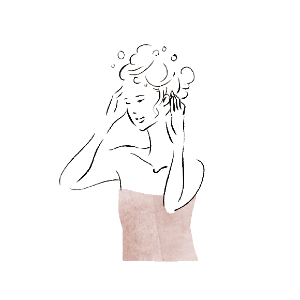 シャンプーの役割は、“頭皮を洗う”こと。頭皮までしっかり濡らし、手のひらで泡立てた泡を髪だけでなく頭全体になじませ、泡のクッションで頭皮をやさしくマッサージするように洗い、すこやかな頭皮へと整えていきましょう。