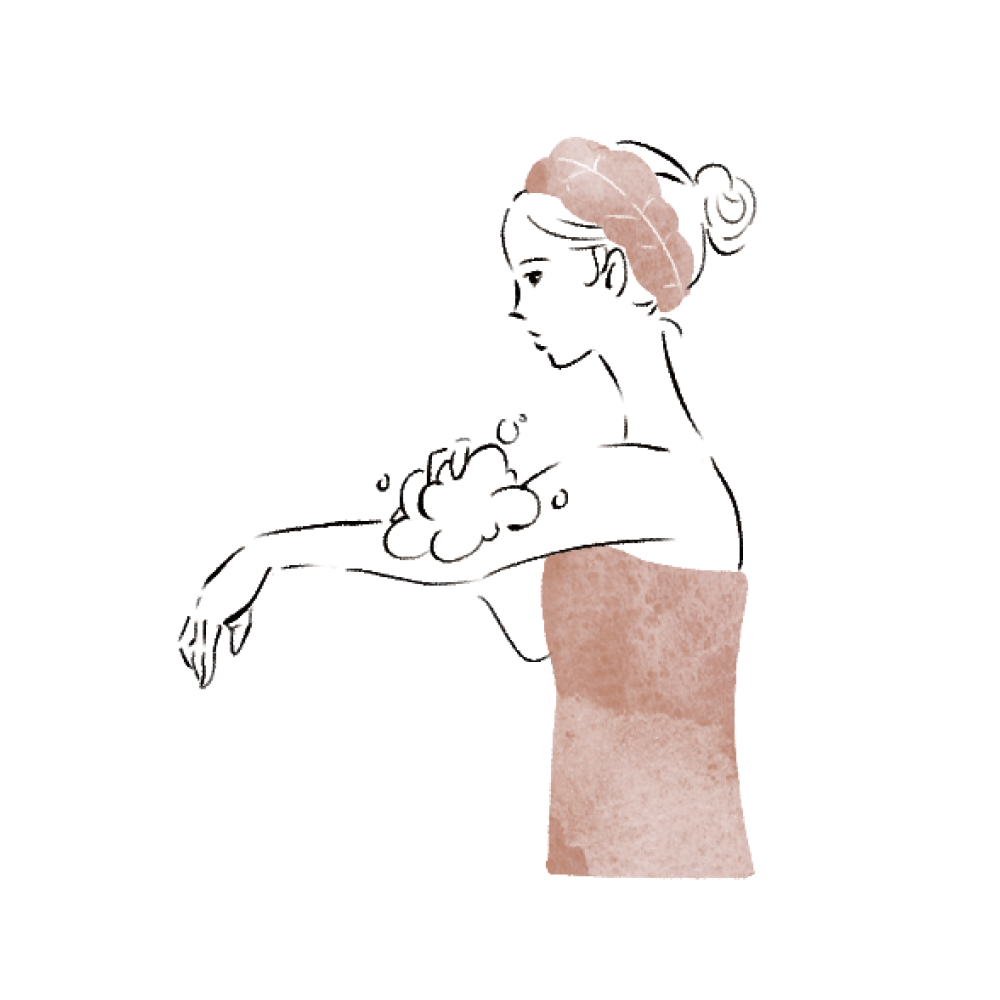 洗髪後は、ボディソープで“やさしい洗い”を。体全体をお湯で濡らし、手ややわらかな素材のタオルなどでしっかりと泡立てます。そして、濃密泡でやさしく洗い、今日も一日頑張ったご自身を癒やしてあげましょう。